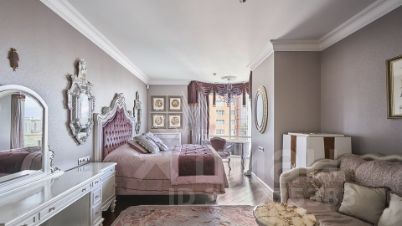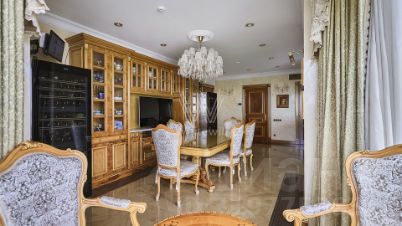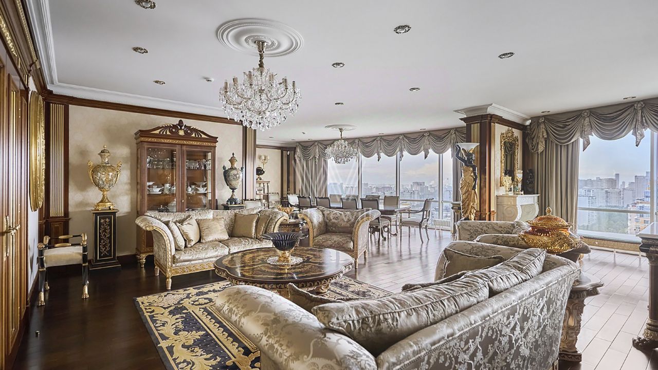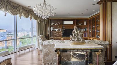Квартира с премиальной отделкой в дворцовом стиле. Потолки украшены витражами, а интерьеры дополнены карнизами, лепными элементами и фурнитурой с золотым напылением.
