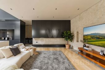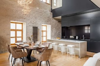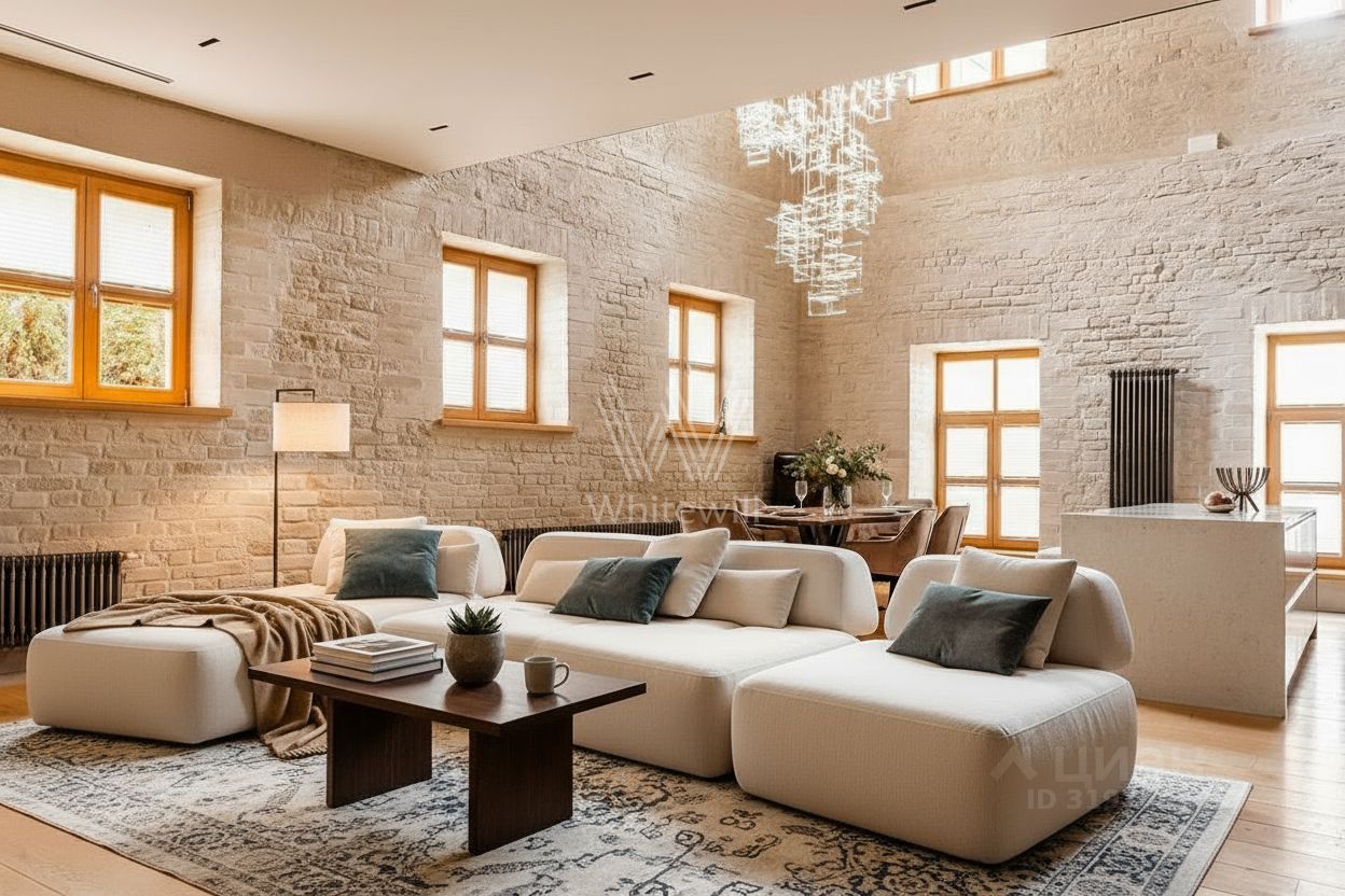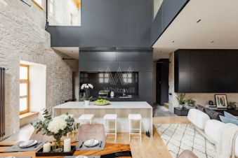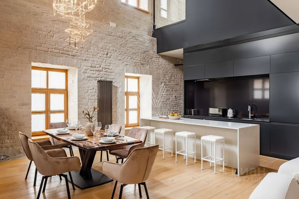 Двухуровневые апартаменты с двумя спальнями площадью 165 м² в клубном доме класса de luxe "Палаты Нарышкина". Апартаменты с отдельным входом расположены на первом и втором этажах. Выполнена отделка в стиле лофт с использованием премиальных материалов — деревянные окна, дубовая инженерная доска, широкоформатный керамогранит Arch-Skin.