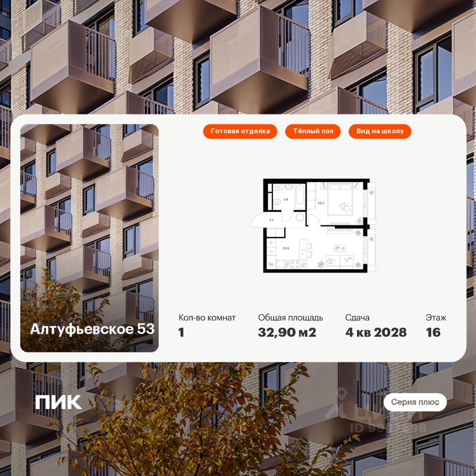 Продаётся 1-комн. квартира площадью 32,9 кв.м на 16 этаже 32 этажного дома (Корпус 1.1, Секция 4) проекта ПИК Алтуфьевское 53. Светлый просторный подъезд на уровне земли, функциональная планировка, большие окна, c отделкой.