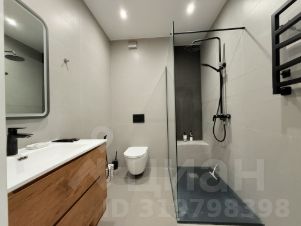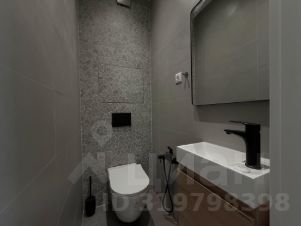 - Основой совмещенный санузел. Здесь установлена современная душевая со стеклянной перегородкой, безбарьерным доступом и тропическим душем, безободковый унитаз-инсталляция, гигиенический душ, теплый пол