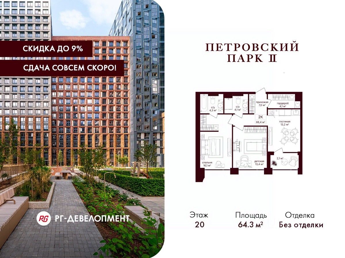 Продаётся 2-комнатная квартира 64,3 кв.м. в ЖК "Петровский парк II" на 20-м этаже 21 этажного дома.