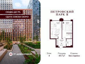 Продаётся 1-комнатная квартира 45,7 кв.м. в ЖК "Петровский парк II" на 4-м этаже 25 этажного дома.