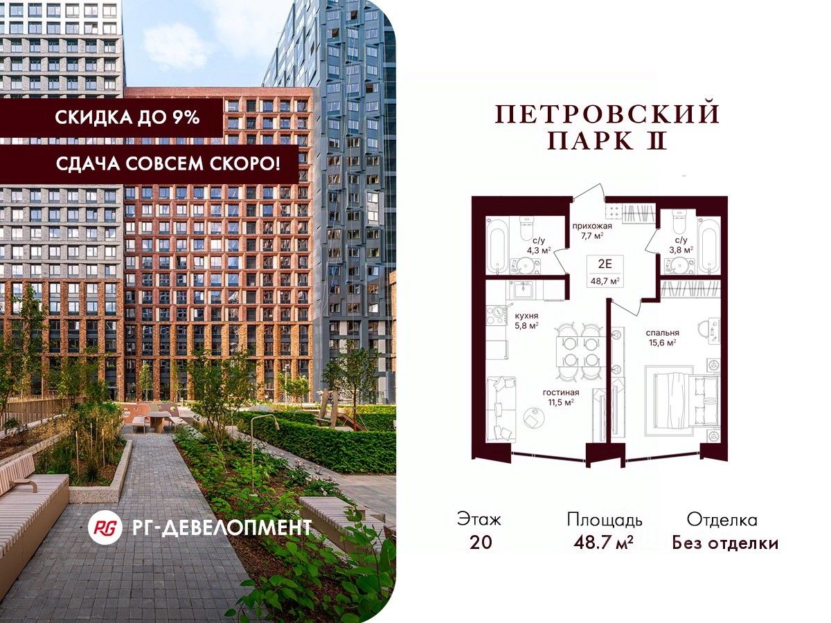 Продаётся 1-комнатная квартира 48,7 кв.м. в ЖК "Петровский парк II" на 20-м этаже 25 этажного дома.