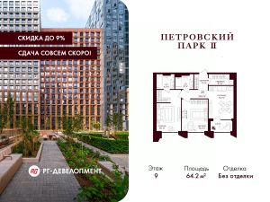 Продаётся 2-комнатная квартира 64,2 кв.м. в ЖК "Петровский парк II" на 9-м этаже 21 этажного дома.