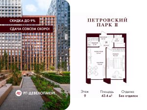 Продаётся 1-комнатная квартира 43,4 кв.м. в ЖК "Петровский парк II" на 9-м этаже 21 этажного дома.