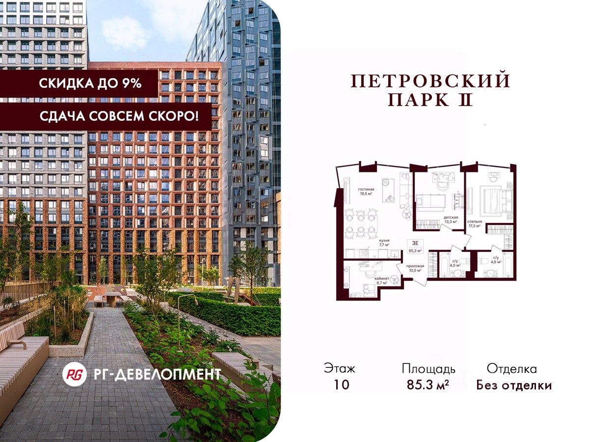 Продаётся 2-комнатная квартира 85,3 кв.м. в ЖК "Петровский парк II" на 10-м этаже 25 этажного дома.