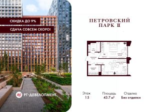 Продаётся 1-комнатная квартира 43,7 кв.м. в ЖК "Петровский парк II" на 15-м этаже 19 этажного дома.