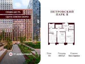 Продаётся 2-комнатная квартира 64,0 кв.м. в ЖК "Петровский парк II" на 10-м этаже 17 этажного дома.