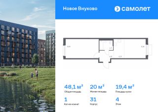 Предлагается 1-комнатная квартира комфорт-класса 48,08 кв.м в корпусе 31 на 4 этаже, в ЖК "Новое Внуково"