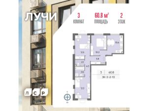 Продается 3-комнатная квартира общей площадью 60.8 кв. метров на 2 этаже жилого комплекса Лучи. Комплекс располагается в 5 минутах ходьбы от станции метро "Солнцево" и в шаговой доступности от железнодорожной станции "Новопеределкино". Жилой комплекс комфорт-класса представляет собой 9 монолитных и панельных многоквартирных домов высотой от 6 до 25 этажей. Комплекс Лучи благоустроен дворами без автомобилей, современными детскими и спортивными площадками и отапливаемыми подземными паркингами. В уютном районе Солнцево, вокруг современного жилого комплекса, вас ждет настоящий комфорт и удобство. Здесь находятся все необходимые социальные объекты: школы, детские сады, культурные центры, магазины и развлекательные заведения. Вы сможете легко пополнить запасы продуктов в ближайших магазинах.
