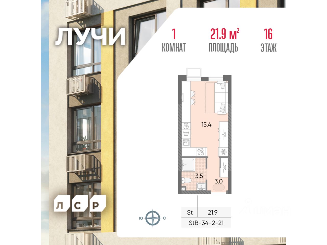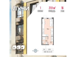 Продается квартира-студия общей площадью 21.9 кв. метров на 16 этаже жилого комплекса Лучи.
