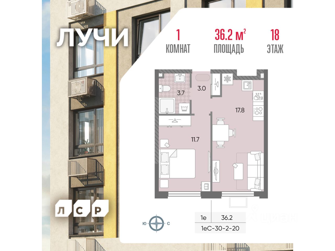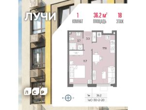 Продается 1-комнатная квартира общей площадью 36.2 кв. метров на 18 этаже жилого комплекса Лучи.