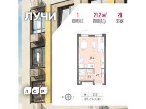Продается квартира-студия общей площадью 21.2 кв. метров на 20 этаже жилого комплекса Лучи.