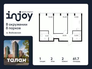 Прямая продажа от застройщика. В жилом квартале, расположенном в Войковском районе Москвы, продаётся 2-комнатная квартира площадью 61.7 кв.м без отделки. Квартира расположена на 2 этаже 35-этажного дома, корпус 1, в жилом квартале бизнес-класса INJOY.