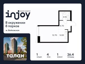 Прямая продажа от застройщика. В жилом квартале, расположенном в Войковском районе Москвы, продаётся 1-комнатная квартира площадью 26.4 кв.м без отделки. Квартира расположена на 4 этаже 35-этажного дома, корпус 1, в жилом квартале бизнес-класса INJOY.