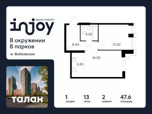 Прямая продажа от застройщика. В жилом квартале, расположенном в Войковском районе Москвы, продаётся 2-комнатная квартира площадью 47.6 кв.м без отделки. Квартира расположена на 13 этаже 35-этажного дома, корпус 1, в жилом квартале бизнес-класса INJOY.