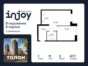 Прямая продажа от застройщика. В жилом квартале, расположенном в Войковском районе Москвы, продаётся 2-комнатная квартира площадью 47.7 кв.м без отделки. Квартира расположена на 11 этаже 35-этажного дома, корпус 1, в жилом квартале бизнес-класса INJOY.