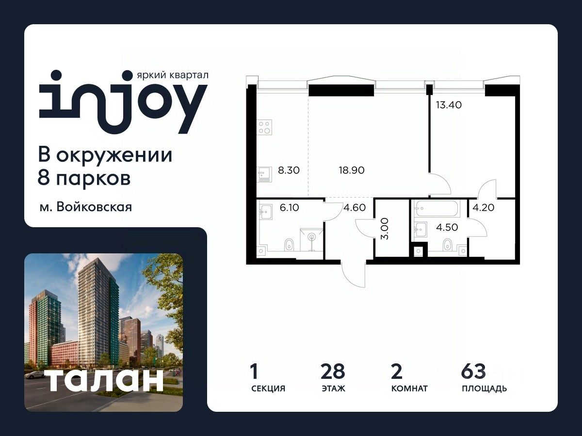 Прямая продажа от застройщика. В жилом квартале, расположенном в Войковском районе Москвы, продаётся 2-комнатная квартира площадью 63 кв.м без отделки. Квартира расположена на 28 этаже 35-этажного дома, корпус 1, в жилом квартале бизнес-класса INJOY.