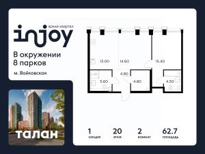 Прямая продажа от застройщика. В жилом квартале, расположенном в Войковском районе Москвы, продаётся 2-комнатная квартира площадью 62.7 кв.м без отделки. Квартира расположена на 20 этаже 35-этажного дома, корпус 1, в жилом квартале бизнес-класса INJOY.