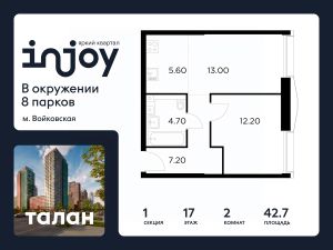 Прямая продажа от застройщика. В жилом квартале, расположенном в Войковском районе Москвы, продаётся 2-комнатная квартира площадью 42.7 кв.м без отделки. Квартира расположена на 17 этаже 35-этажного дома, корпус 1, в жилом квартале бизнес-класса INJOY.