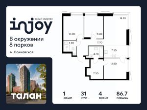 Прямая продажа от застройщика. В жилом квартале, расположенном в Войковском районе Москвы, продаётся 4-комнатная квартира площадью 86.7 кв.м без отделки. Квартира расположена на 31 этаже 35-этажного дома, корпус 1, в жилом квартале бизнес-класса INJOY.
