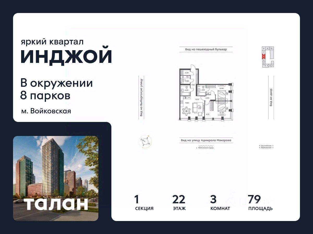 Прямая продажа от застройщика. В жилом квартале, расположенном в Войковском районе Москвы, продаётся 3-комнатная квартира площадью 79 кв.м без отделки. Квартира расположена на 22 этаже 35-этажного дома, корпус 1, в жилом квартале бизнес-класса Инджой.