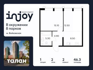Прямая продажа от застройщика. В жилом квартале, расположенном в Войковском районе Москвы, продаётся 2-комнатная квартира площадью 46.3 кв.м без отделки. Квартира расположена на 2 этаже 35-этажного дома, корпус 1, в жилом квартале бизнес-класса INJOY.
