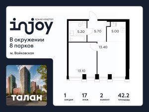 Прямая продажа от застройщика. В жилом квартале, расположенном в Войковском районе Москвы, продаётся 2-комнатная квартира площадью 42.2 кв.м без отделки. Квартира расположена на 17 этаже 35-этажного дома, корпус 1, в жилом квартале бизнес-класса INJOY.