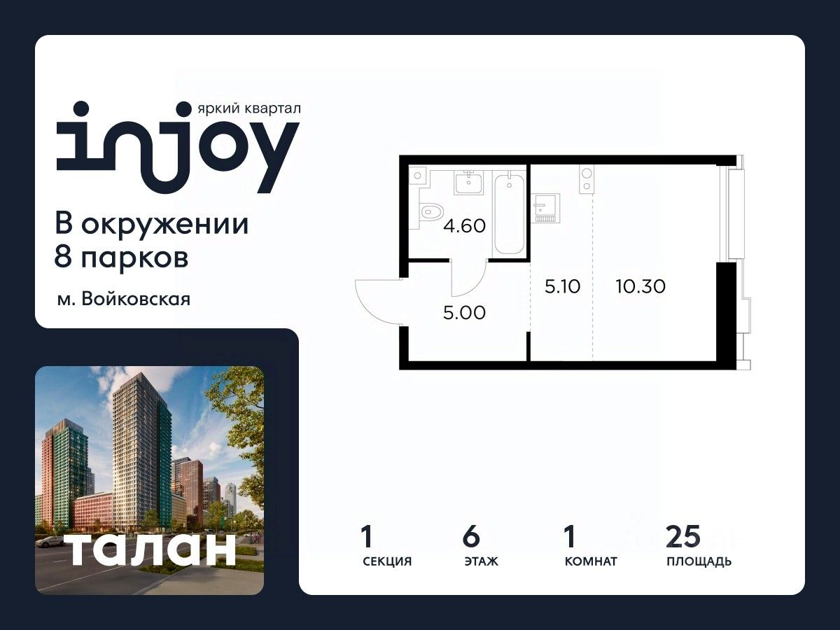 Прямая продажа от застройщика. В жилом квартале, расположенном в Войковском районе Москвы, продаётся 1-комнатная квартира площадью 25 кв.м без отделки. Квартира расположена на 6 этаже 35-этажного дома, корпус 1, в жилом квартале бизнес-класса INJOY.