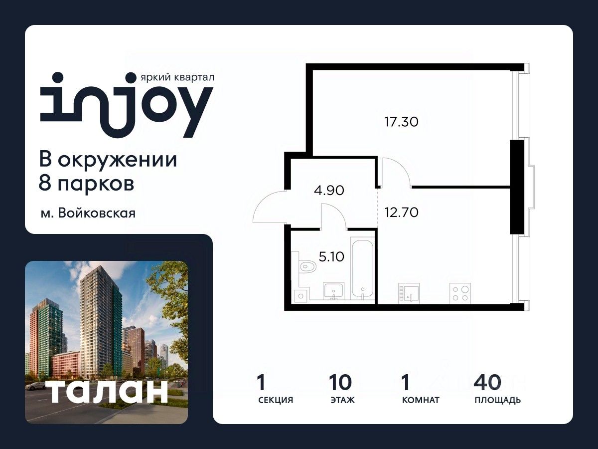 Прямая продажа от застройщика. В жилом квартале, расположенном в Войковском районе Москвы, продаётся 1-комнатная квартира площадью 40 кв.м без отделки. Квартира расположена на 10 этаже 35-этажного дома, корпус 1, в жилом квартале бизнес-класса INJOY.