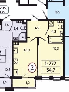 Продаётся однокомнатная квартира в современном жилом комплексе Бунинские Кварталы в районе Коммунарка, Москва. Площадь квартиры составляет 34.7 кв. м, из которых 12.3 кв. м жилая площадь и 12 кв. м отведено под кухню. Квартира расположена на 5 этаже 18-этажного дома. Высокие потолки (2.99 метра) по бетону. Окна выходят на улицу, что обеспечивает хорошую освещенность в течение дня.