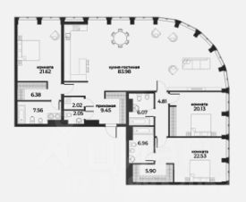Возможное планировочное решение: просторная кухня-гостиная, две мастер-спальни со своими ванными и гардеробными комнатами, спальня/кабинет с санузлом, гостевой санузел, прихожая.