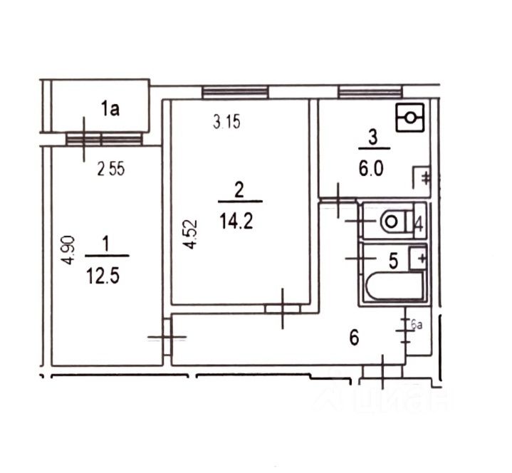 Комнаты: 14,2 мкв и 12,5 мкв. Кухня 6 мкв.