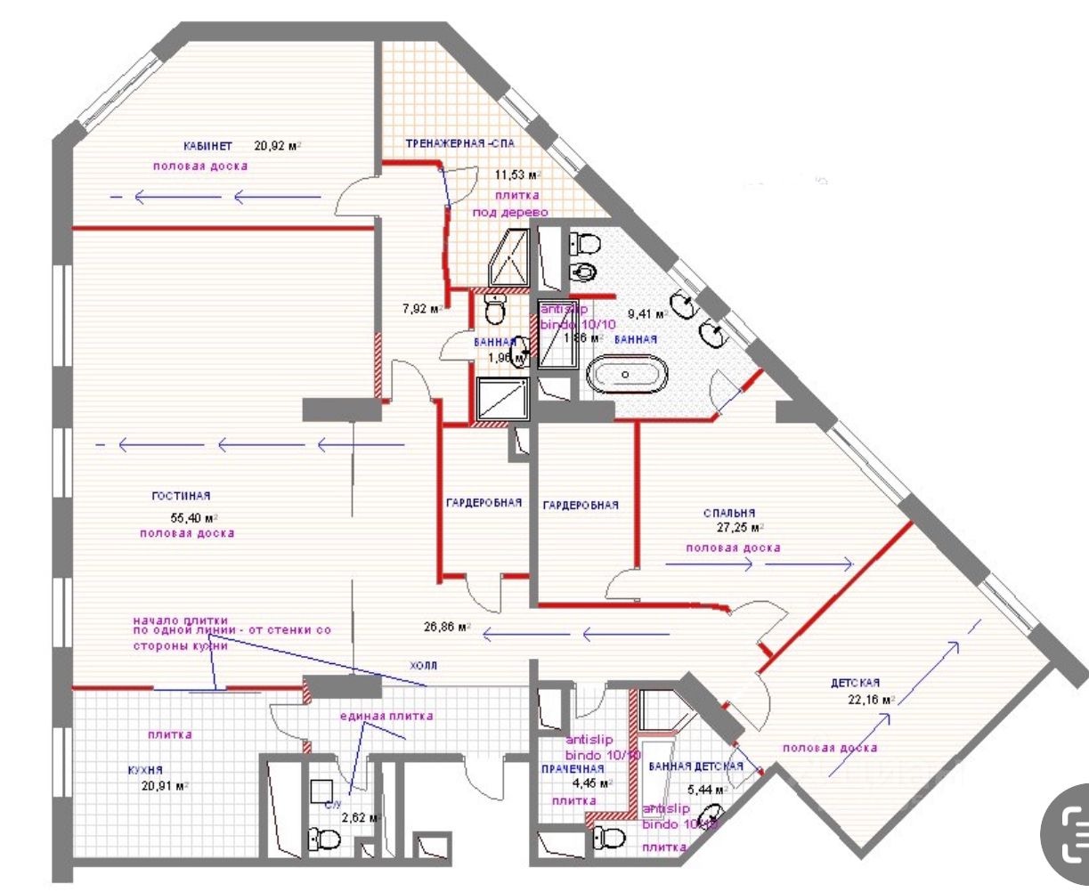 Грамотная, хорошо продуманная планировка, три удобные мастер- спальни со своими собственными полноценными санузлами, просторная гостиная, кухня, комната спа- зона с вертикальным солярием, паровой гидромассажной душевой кабиной и беговой дорожкой. Квартира как бы разделена на публичную и приватные части в американском духе. Две просторные гардеробные и постирочная позволяют разгрузить основные помещения от ненужных шкафов.