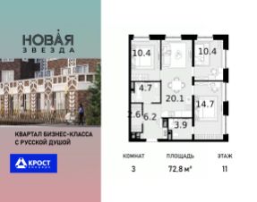 Продаётся 3-к квартира 72.8 кв.м. на 11-м этаже 22 этажного дома, корпус 6 - Резиденция "Хабаровск". Без отделки.