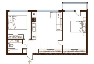 Планировка: кухня-гостиная, 2 спальни, ванная комната.