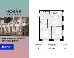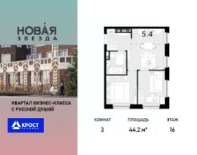 Продаётся 3-к квартира 44.2 кв.м. на 16-м этаже 22 этажного дома, корпус 3 - Резиденция "Краснодар". Без отделки.