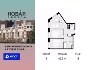 Продаётся 3-к квартира 60.3 кв.м. на 13-м этаже 22 этажного дома, корпус 3 - Резиденция "Краснодар". Без отделки.