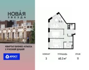 Продаётся 3-к квартира 60.3 кв.м. на 11-м этаже 22 этажного дома, корпус 3 - Резиденция "Краснодар". Без отделки.