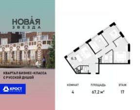 Продаётся 4-к квартира 67.2 кв.м. на 17-м этаже 22 этажного дома, корпус 3 - Резиденция "Краснодар". Без отделки.