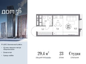 В премиум-квартале "Дом 56" на Бауманской напрямую от девелопера ГК "Галс-Девелопмент" представлена студия на 23 этаже общей площадью 29.40 м².