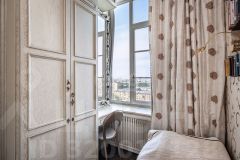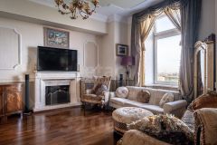 Двухэтажный пентхаус площадью 340 м² расположен на верхних уровнях (14-й и 15-й этажи) сталинского дома с башнями в престижном районе Воробьёвых гор. Объект отличается рекордной высотой потолков — от 3,7 до 4 метров, изолированным входом и панорамным остеклением с видами на четыре стороны света, включая Лужники, МГУ, Москва-Сити и живописные закаты над городом.