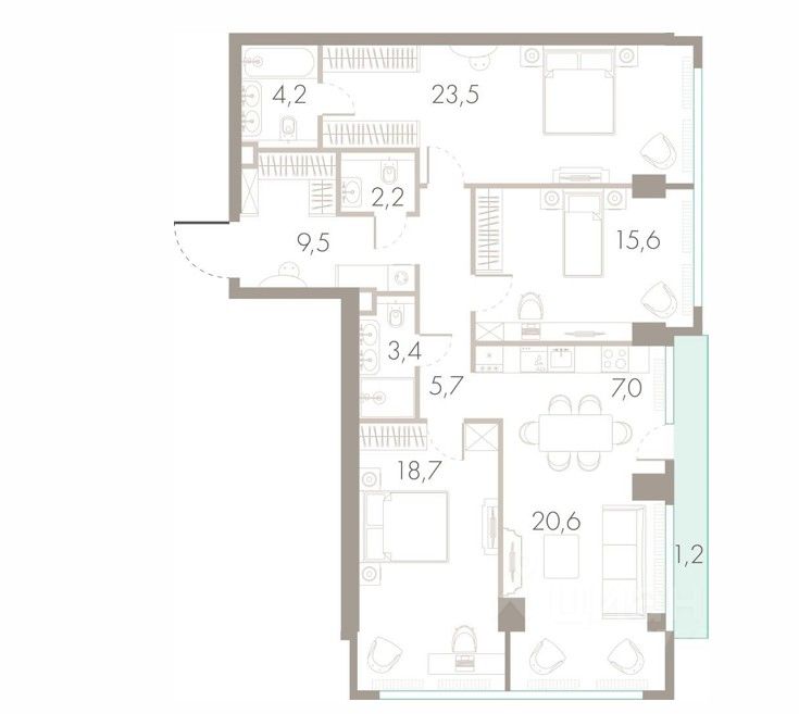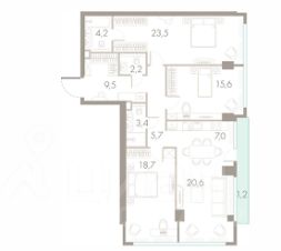 Удобная планировка квартиры 111,3м2, в которой предусмотрено: кухня-гостиная 27,6м2, мастер-спальня 27,2м2, спальни 15,6м2 и 18,7м2, холл 9,5м2, три санузла с возможностью установки ванны и душевой системы.