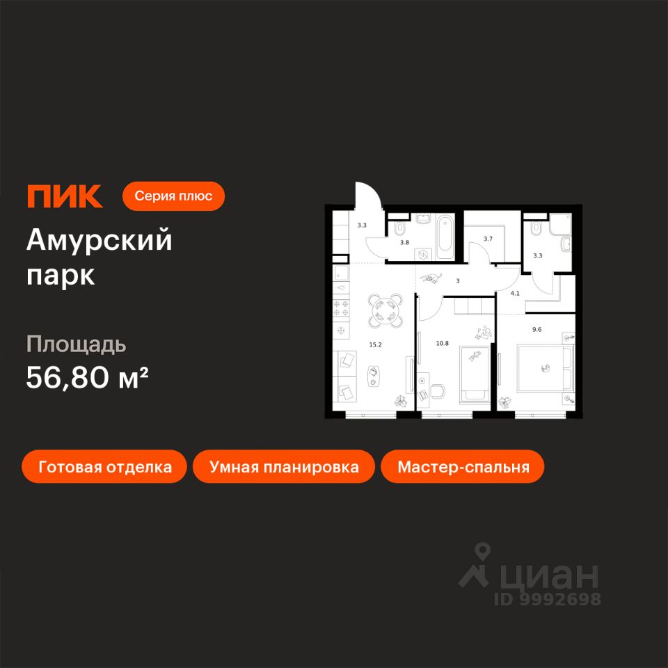 Продаётся 2-комн. квартира площадью 56,8 кв.м на 8 этаже 27 этажного дома (Корпус 4.5, Секция 6) проекта ПИК Амурский парк. Светлый просторный подъезд на уровне земли, функциональная планировка, большие окна, c отделкой.