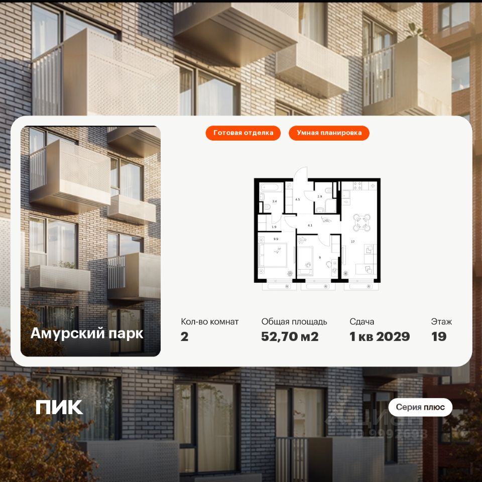 Продаётся 2-комн. квартира площадью 52,7 кв.м на 19 этаже 27 этажного дома (Корпус 4.5, Секция 6) проекта ПИК Амурский парк. Светлый просторный подъезд на уровне земли, функциональная планировка, большие окна, c отделкой.