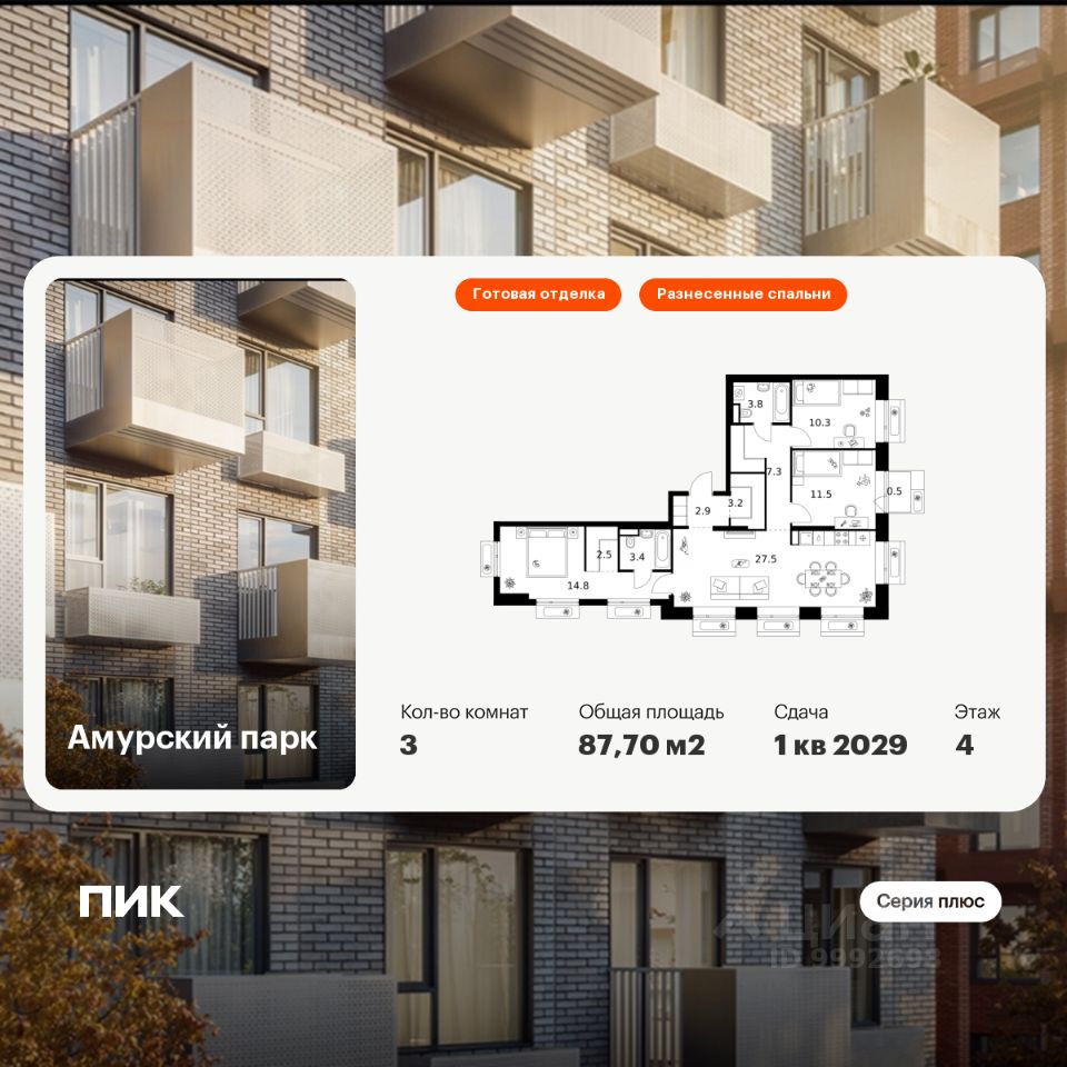 Продаётся 3-комн. квартира площадью 87,7 кв.м на 4 этаже 19 этажного дома (Корпус 4.4, Секция 5) проекта ПИК Амурский парк. Светлый просторный подъезд на уровне земли, функциональная планировка, большие окна, c отделкой.