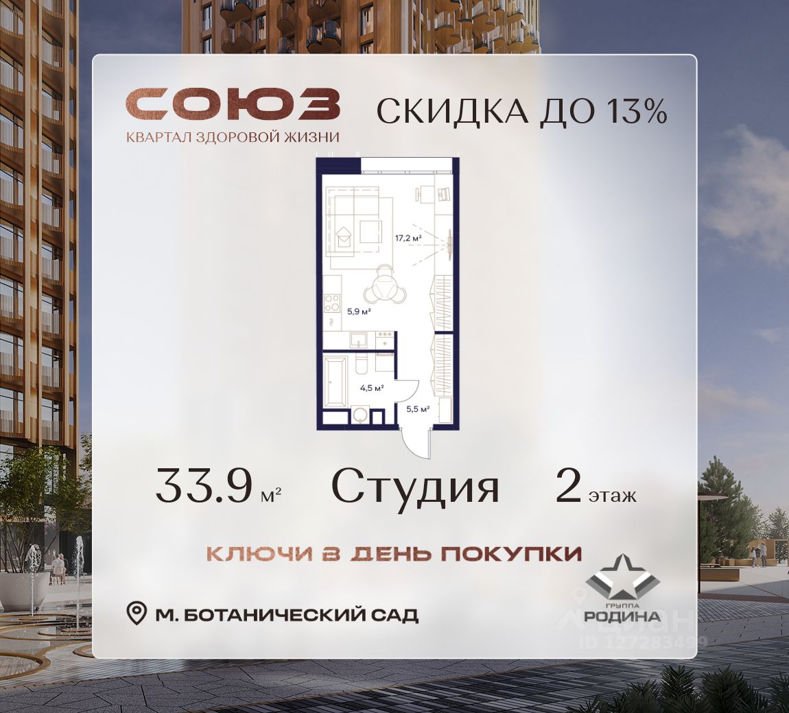 Продаётся квартира-студия площадью 33.9 м² на 2 этаже в Жилом Комплексе "Союз".