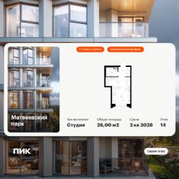 Продаётся квартира-студия площадью 26 кв.м на 14 этаже 25 этажного дома (Корпус 4.6, Секция 4) проекта ПИК Матвеевский парк. Светлый просторный подъезд на уровне земли, функциональная планировка, большие окна, c отделкой.