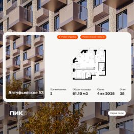 Продаётся 2-комн. квартира площадью 61,1 кв.м на 28 этаже 32 этажного дома (Корпус 1.1, Секция 2) проекта ПИК Алтуфьевское 53. Светлый просторный подъезд на уровне земли, функциональная планировка, большие окна, c отделкой.
