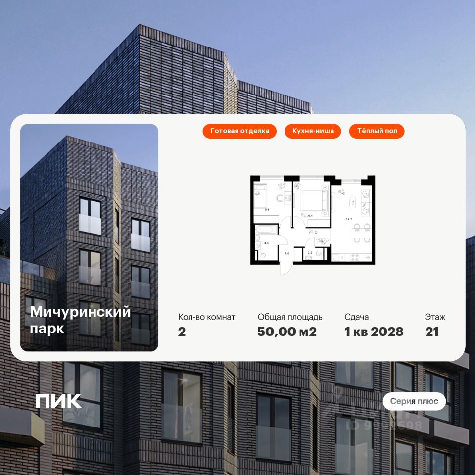 Продаётся 2-комн. квартира площадью 50 кв.м на 21 этаже 31 этажного дома (Корпус 4.3, Секция 2) проекта ПИК Мичуринский парк. Светлый просторный подъезд на уровне земли, функциональная планировка, большие окна, c отделкой.